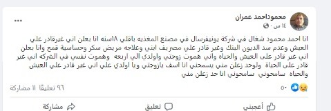 ونشر أحد عمال الشركة منشور يهدده فيه بقتل زوجته وأبنائه الأربعة بسبب الظروف الاقتصادية والمادية الصعبة التي يمر بها.