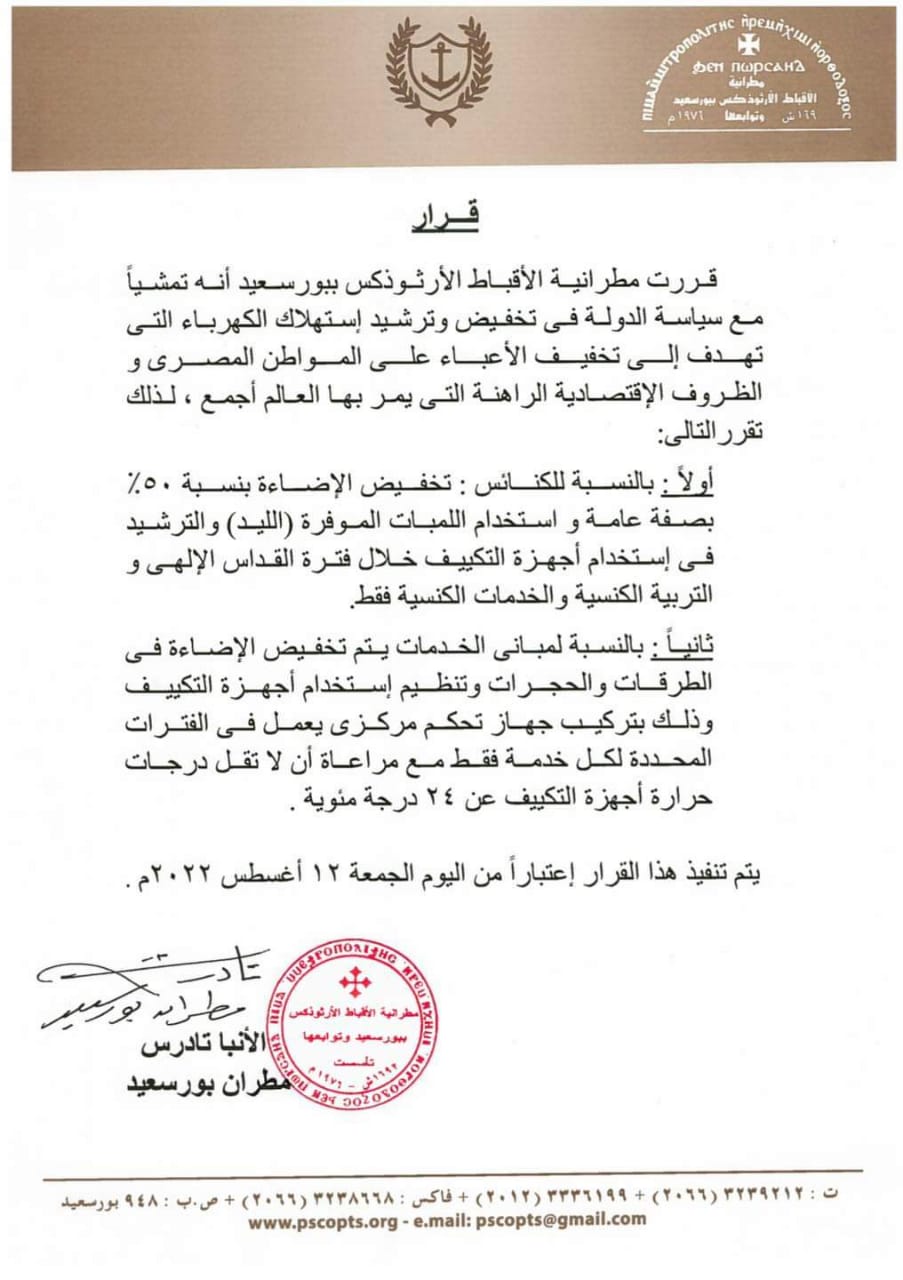 أصدرت مطرانيه الاقباط الارثوذكس في بورسعيد برئاسة الأنبا تادرس مطران محافظة بورسعيد وضواحيها بيان صحفي أعلنت فيه اتخاذ إجراءات عاجلة لترشيد استهلاك الكهرباء، وذلك تماشيا مع سياسة الدولة في ذلك الأمر.