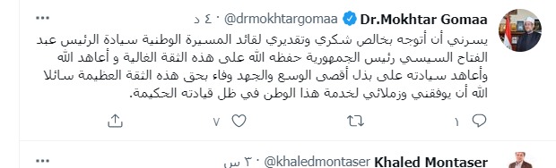 كتب الدكتور محمد مختار جمعة، وزير الأوقاف، أقدم وزير في حكومة الدكتور مصطفى مدبولي، عبر حسابه الرسمي على موقع التغريدات القصيرة تويتر: يسرني أن أتوجه بخالص شكري وتقديري لقائد المسيرة الوطنية الرئيس عبد الفتاح السيسي رئيس الجمهورية، حفظه الله على هذه الثقة الغالية.