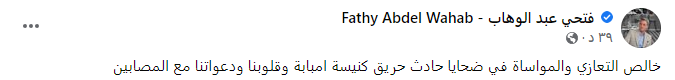 وكتب الفنان فتحي عبد الوهاب عبر صفحته على موقع التواصل الاجتماعي فيسبوك، قائلًا: خالص التعازي والمواساة في ضحايا حادث حريق كنيسة إمبابة وقلوبنا ودعواتنا مع المصابين.