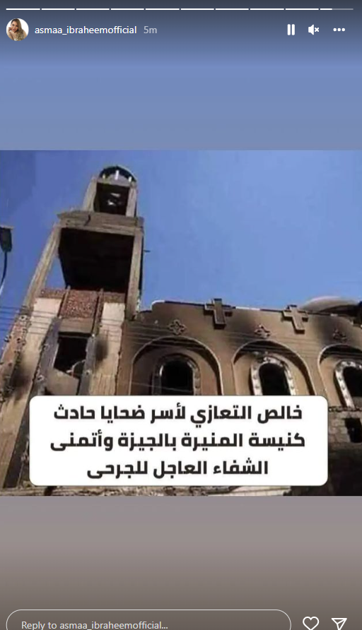 كما قدمت الإعلامية أسما إبراهيم واجب العزاء في ضحايا حادث كنيسة المنيرة، وكتبت عبر ستوري انستجرام: خالص التعازي لأسر ضحايا حادث كنيسة المنيرة بالجيزة وأتمنى الشفاء العاجل للمصابين.