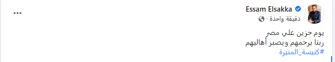 وعبّر الفنان عصام السقا عن حزنه على ذلك الحادث، وكتب عبر حسابه الشخصي على فيسبوك، الآتي: يوم حزين على مصر.. ربنا يرحمهم ويصبر أهاليهم.. كنيسة المنيرة.