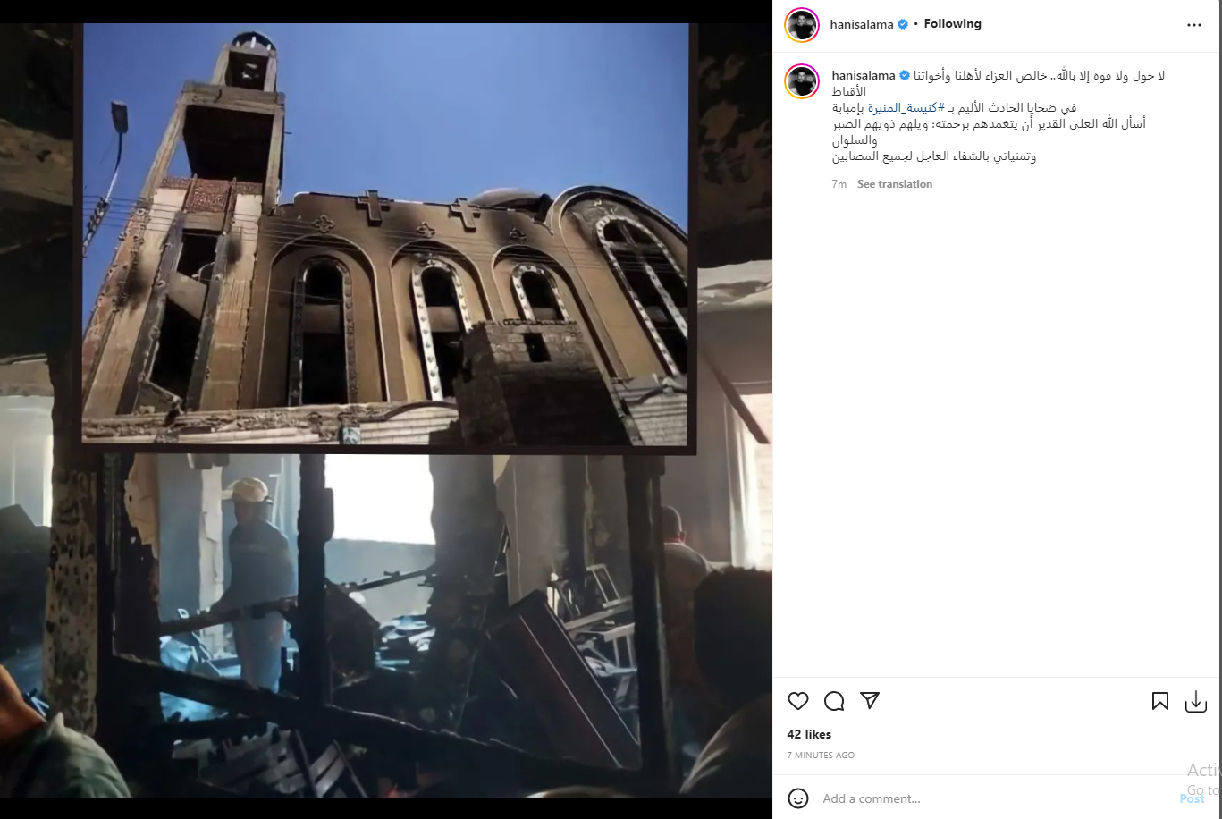وقدم الفنان هاني سلامة واجب العزاء، عبر حسابه على انستجرام، وعلق قائلًا: لا حول ولا قوة إلا بالله خالص العزاء لأهلنا وأخواتنا الأقباط في ضحايا الحادث الأليم بكنيسة المنيرة بإمبابة.. اسأل الله العلي القدير أن يتغمدهم برحمته ويلهم ذويهم الصبر والسلوان.. وتمنياتي بالشفاء العاجل لجميع المصابين.
