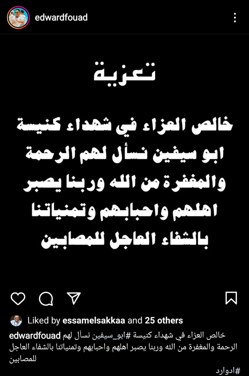 وعبّر إدوارد عن حزنه على ضحايا حادث حريق كنيسة إمبابة، وعلق على الحادث عبر حسابه على انستجرام، وكتب: خالص العزاء في شهداء كنيسة أبو سيفين نسأل لهم الرحمة والمغفرة من الله وربنا يصبر أهلهم وأحبابهم وتمنياتنا بالشفاء العاجل للمصابين.