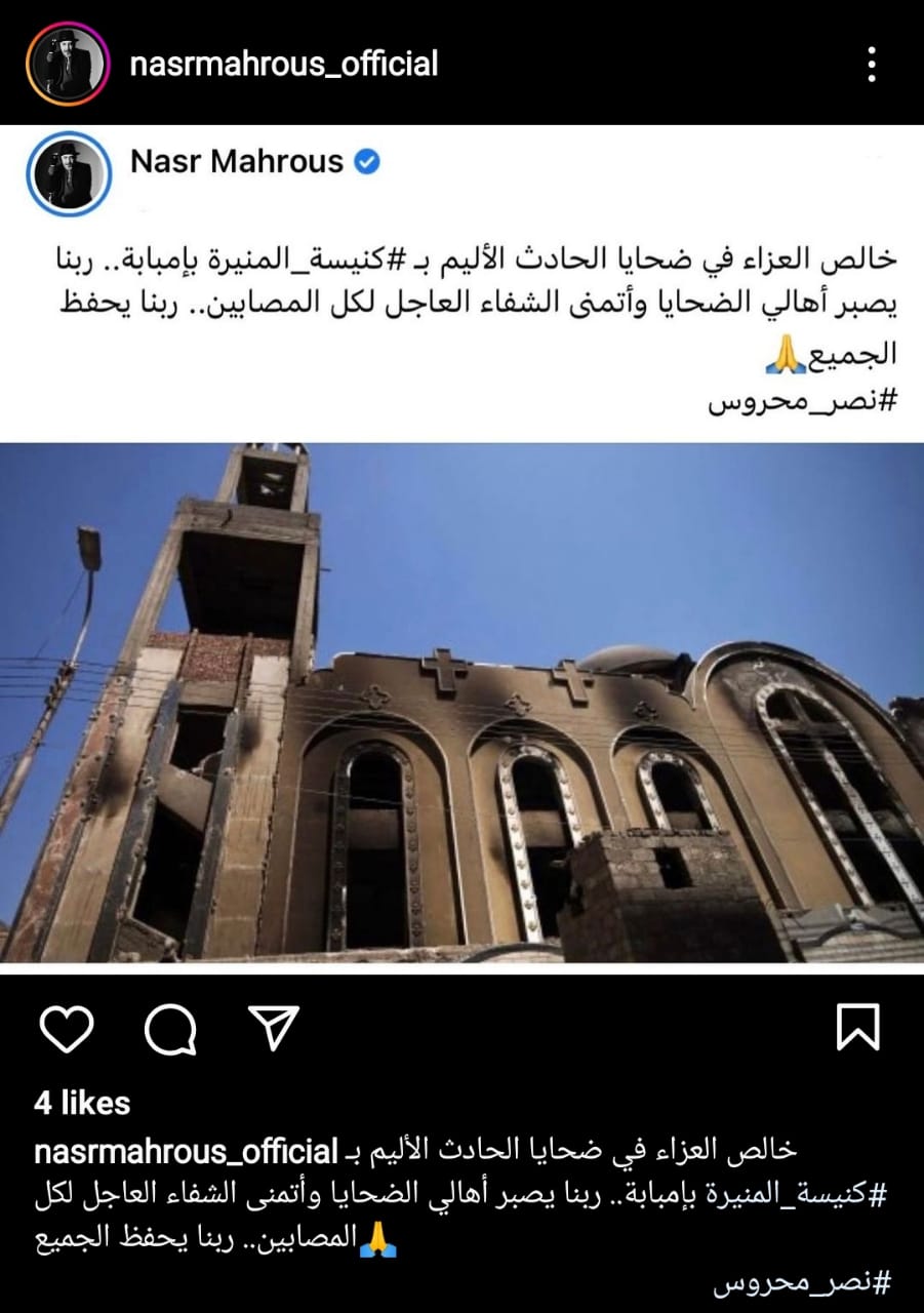 كما واسى المنتج نصر محروس الأقباط أسر الضحايا والمصابين بحادث حريق كنيسة المنيرة بإمبابة، وكتب على فيسبوك وانستجرام: خالص العزاء في ضحايا الحادث الأليم بكنيسة المنيرة بإمبابة ربنا يصبر أهالي الضحايا وأتمنى الشفاء العاجل لكل المصابين ربنا يحفظ الجميع.