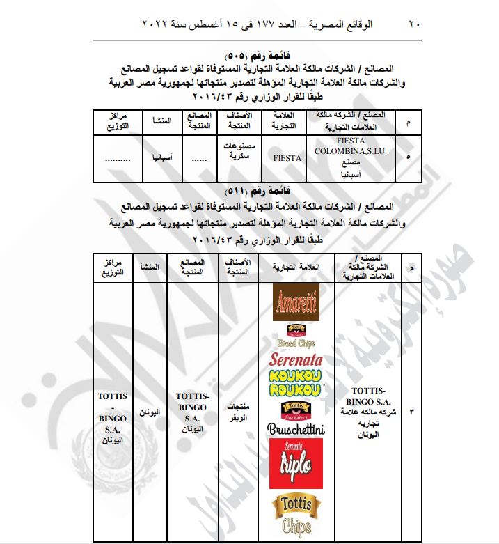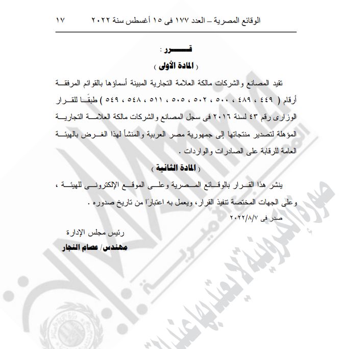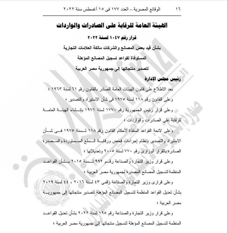 في 25 أكتوبر 2022، طالبت لجنة التجارة الخارجية بالشعبة العامة للمستوردين باتحاد الغرف التجارية، برئاسة أحمد الملواني، وزارة التجارة والصناعة بضرورة إلغاء قراري 43 و44 الخاص بتسجيل المصانع الأجنبية المؤهلة للتصدير لمصر في ظل تطبيق نظام التسجيل المُسبق للشحنات.