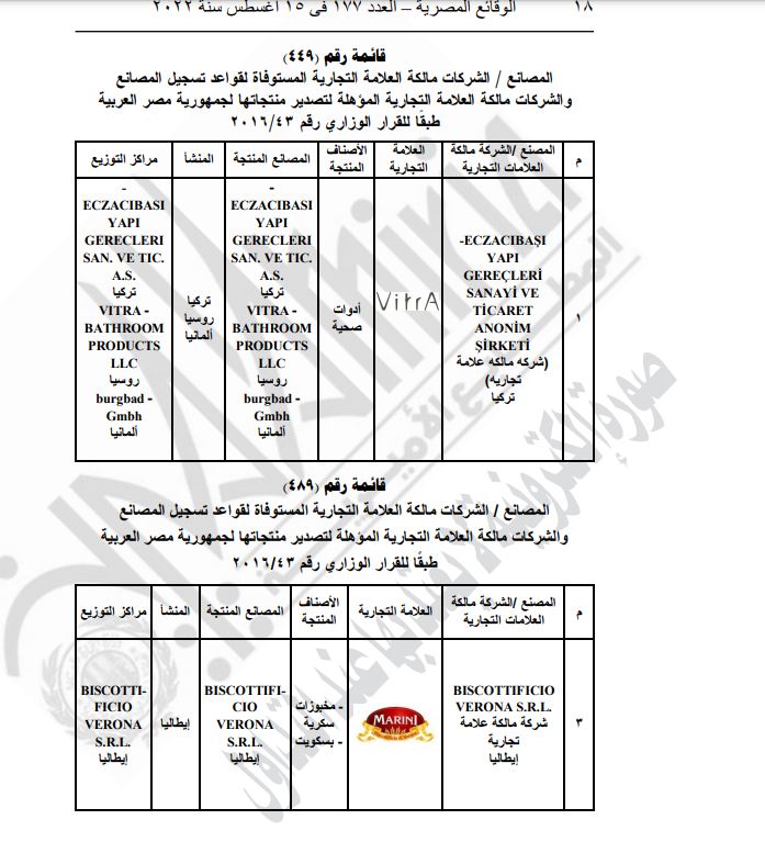 وأوضحت الهيئة في نص قرار، نشرته الجريدة الرسمية للدولة، اليوم الاثنين، أنه تمت الموافقة على قيد شركات روسية وصينية وإيطالية وتركية ويونانية، في سجل المصدرين إعمالا لأحكام القرار رقم 43 لسنة 2016 المعدل بنص قرار وزاري من الوزيرة السابقة نيفين جامع مطلع العام الحالي 2022.