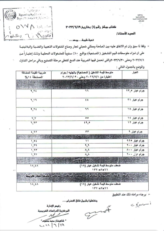 كما تقرر تنفيذ كتاب رئيس الإدارة المركزية للدراسات الضريبية - مصلحة الضرائب المصرية - قيمة مضافة، رقم 5178 في 19 يونيه الماضي والوارد لمصلحة الجمارك في 10 أغسطس الجاري بخصوص ما تم الاتفاق عليه بين مصلحة الضرائب المصرية والاتحاد العام للغرف التجارية (شعبتي تجار وصناع المشغولات الذهبية والفضية والبلاتينية ) لمتوسطات قيم التشغيل المصنعية اعتبارا من أول يوليو الجاري وحتى نهاية يونيه المقبل 2023 على ان تزاد بواقع 10% سنويا.