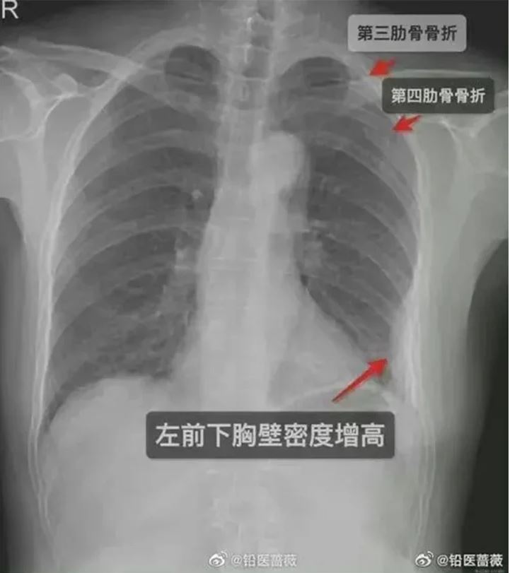 وبعد خمسة أيام من العناق الشديد، اشتد الألم إلى درجة كبيرة في صدر المرأة، وذهبت إلى المستشفى لإجراء فحص طبي، ليكشف فحص بالأشعة السينية تعرض 3 ضلوع لكسور، اثنان على الجانب الأيمن من قفصها الصدري وواحد على اليسار.