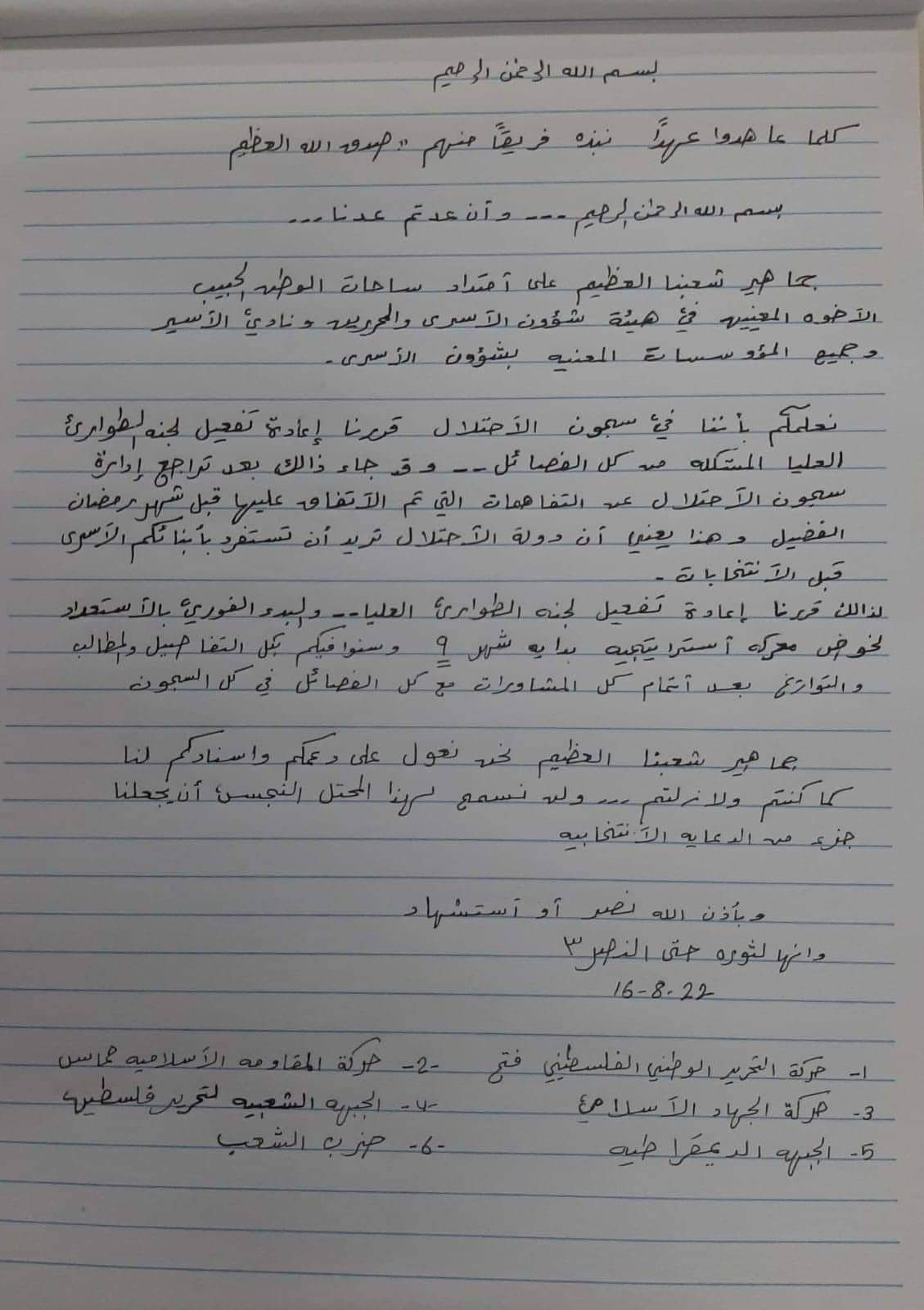 وجاء في الرسالة، الموجهة للشعب الفلسطيني والمؤسسات الفلسطينية المعنية بشؤون الأسرى: سنوافيكم بكل المطالب والتواريخ بعد إتمام كل المشاورات مع كل الفصائل في كل السجون.