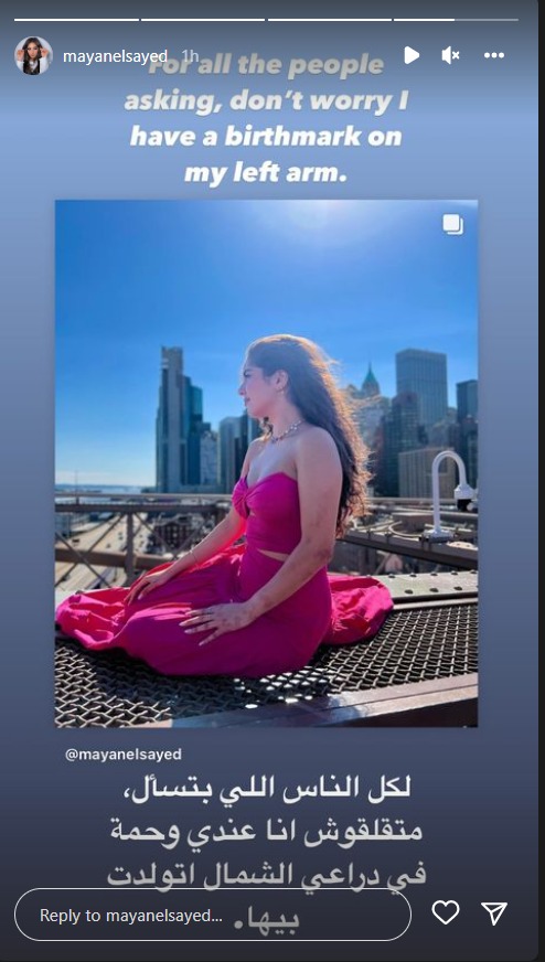 ونشرت مايان السيد عبر حسابها الشخصي بـ انستجرام؛ صورة لها عبر استوري، وعلقت عليها: لكل الناس اللي بتسأل متقلقوش أنا عندي وحمة في دراعي الشمال اتولدت بيها.