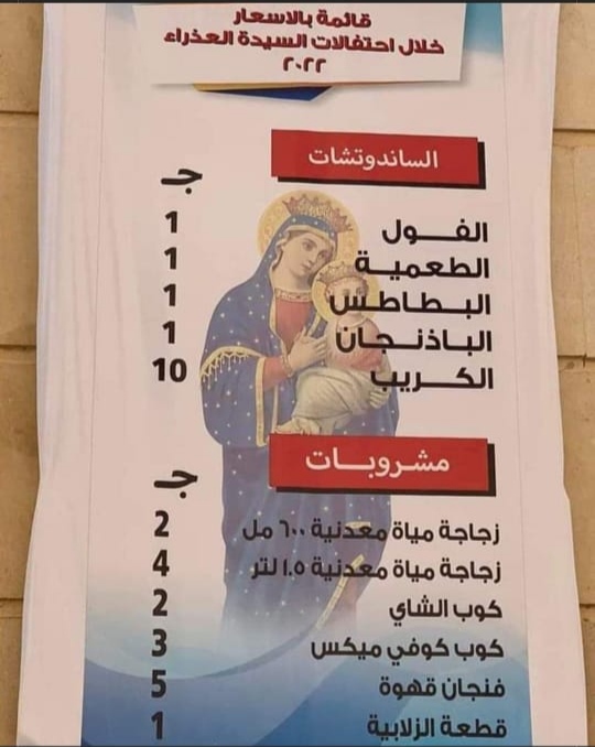تداول عدد من مستخدمي مواقع التواصل الاجتماعي فيسبوك، وفي الصفحات القبطية، قائمة مُصورة للطعام ومشروبات منخفضة الأسعار في مولد السيدة العذراء مريم بجبل درنكة بمحافظة أسيوط.