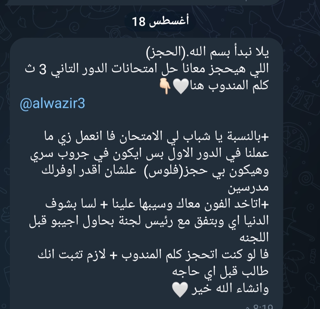 وكتب شاومينج عبر تطبيق التليجرام: يلا نبدأ بسم الله الحجز، اللي هيحجز معانا حل امتحانات الدور التاني 3 ثانوي، وبالنسبة يا شباب للامتحان فنعمل زي ما عملنا في الدور الأول.