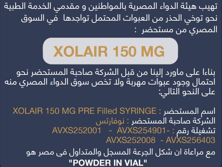 حذرت هيئة الدواء المصرية، المواطنين ومقدمي الخدمات الطبية من عبوات مهربة من دواء زولير 150مجم، xolair150MG إنتاج شركة نوفارتس، محتمل تواجدها بالسوق المصري.