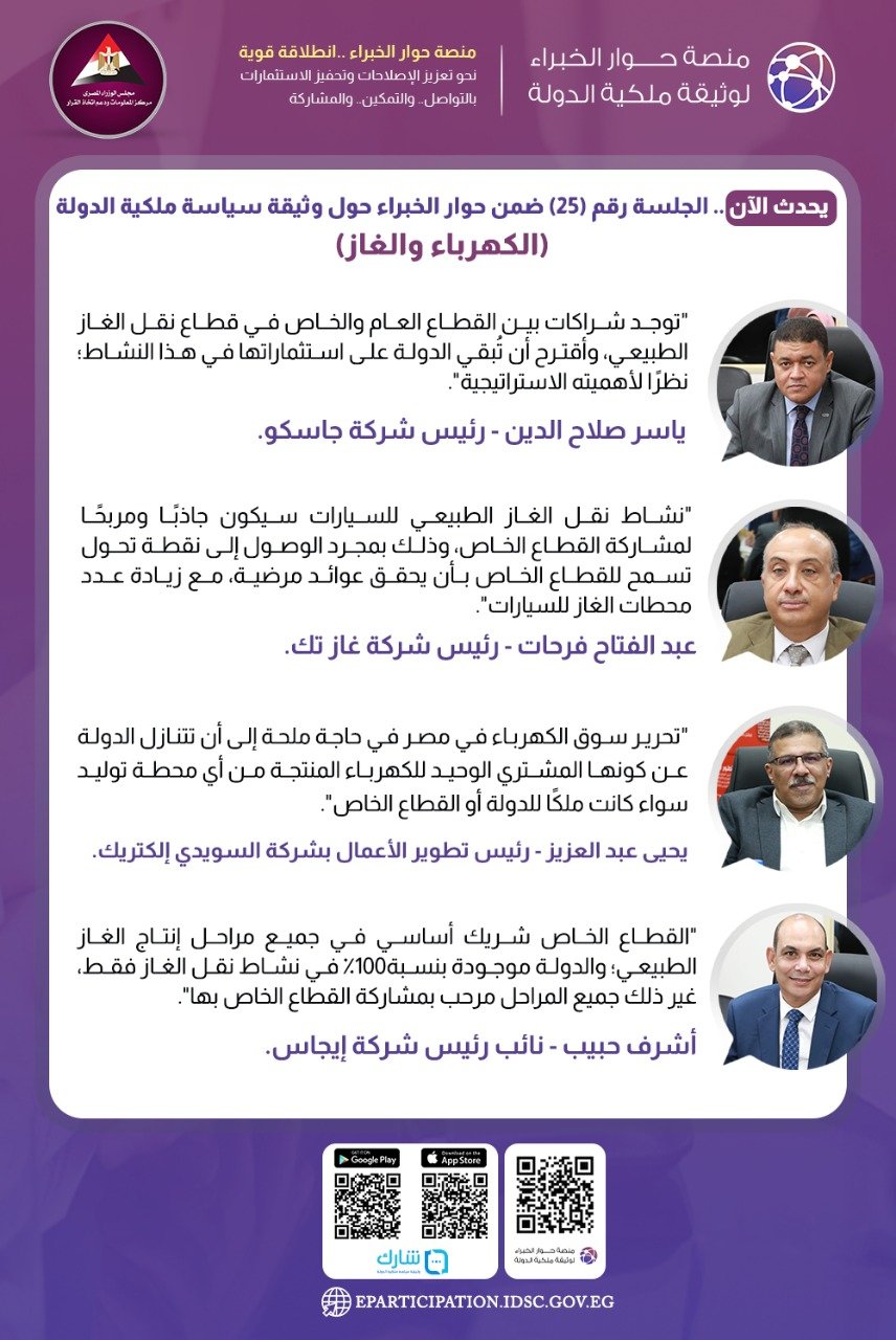 يعقد مركز المعلومات التابع إلى مجلس الوزراء، الجلسة الـ25 من سلسلة جلسات حول وثيقة سياسة ملكية الدولة، وذلك بشأن الكهرباء والغاز، بحضور ياسر صلاح الدين رئيس شركة جاسكو، وعبد الفتاح فرحات رئيس شركة غاز تك، ويحيى عبد العزيز رئيس تطوير الأعمال بشركة السويدي إليكترويك، وأشرف حبيب، نائب رئيس شركة إيجاس.
