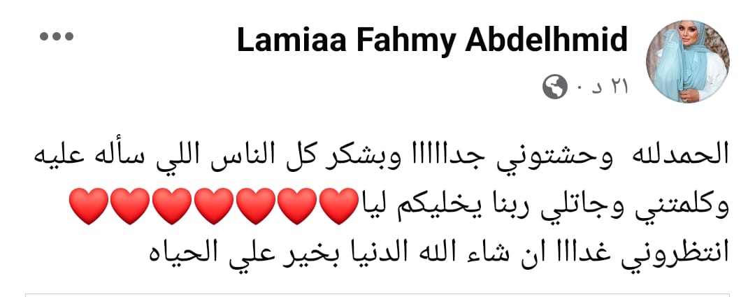وكتبت لمياء فهمي منشورًا، عبر حسابها الشخصي بموقع التواصل الاجتماعي فيس بوك، قالت فيه: الحمد لله وحشتوني جدًا، وبشكر كل الناس اللي سألت عليا وكلمتني وجاتلي، ربنا يخليكم ليا.. وانتظروني غدا إن شاء الله في برنامج الدنيا بخير على الحياة.