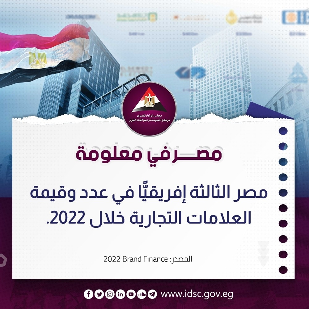 وتابع مركز المعلومات التابع إلى مجلس الوزراء، أن تصنيف مصر الثالث في عدد وقيمة العلامات التجارية في عام 2022، جاء بإجمالي 13 علامة تجارية لمؤسسات وشركات محلية بمصر من 150 علامة تجارية إفريقية، وفقًا لمؤسسة براندفاينانس لتقييم العلامات التجارية الأعلى في إفريقيا.