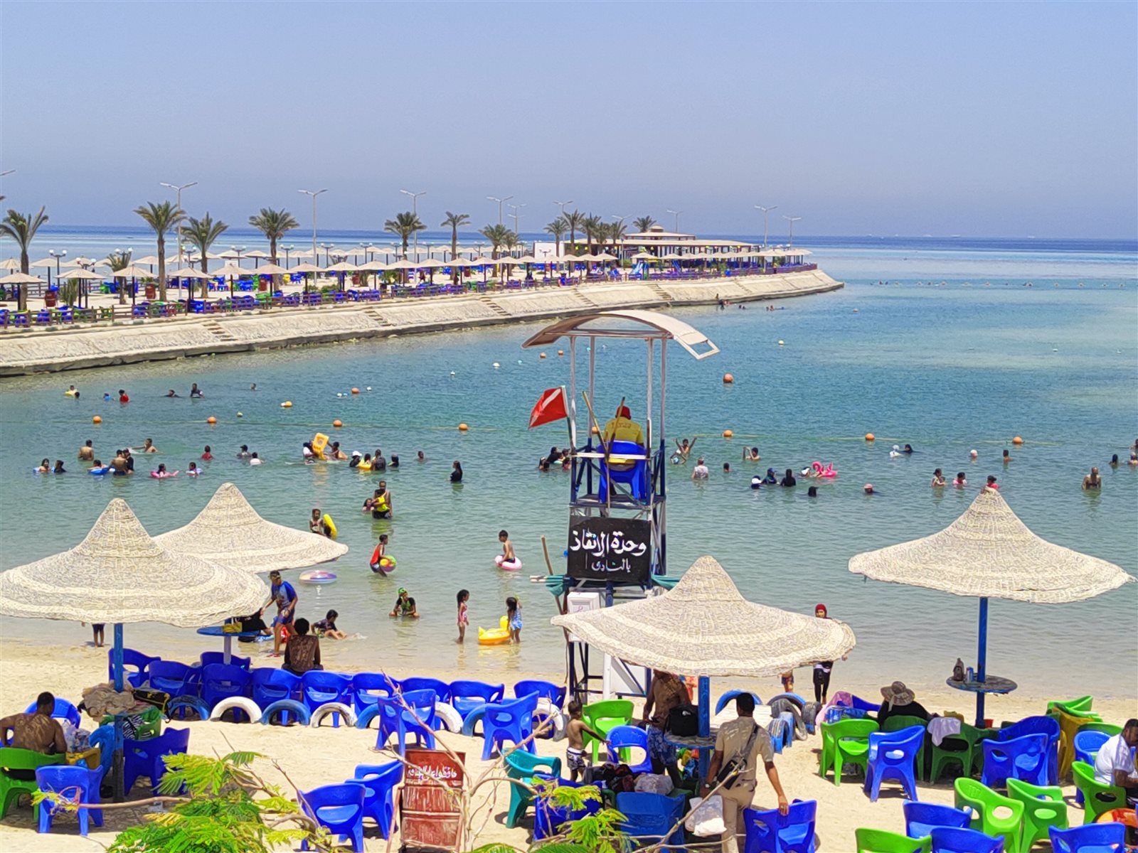 شهد شاطئ النادي الاجتماعي أكبر الشواطئ العامة بالغردقة، صباح اليوم الإثنين، إقبالا كبيرا من المواطنين، منذ ساعات الصباح، هربًا من ارتفاع درجات الحرارة.