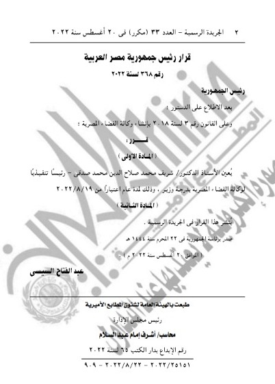 نشرت الجريدة الرسمية، قرار الرئيس عبد الفتاح السيسي، رئيس الجمهورية، بشأن تعيين الدكتور شريف محمد صلاح الدين صدقي، رئيسًا تنفيذيًا لـ وكالة الفضاء المصرية بدرجة وزير وذلك لمدة عام اعتبارًا من 19-8-2022.