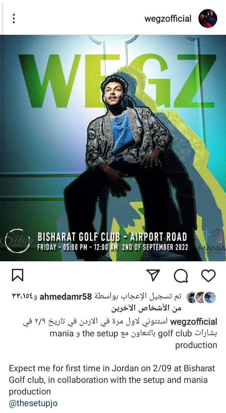 وسبق وروج ويجز للحفل عبر حسابه الشخصي بموقع انستجرام، ونشر البوستر الرسمي للحفل وعلق عليه قائلا: استنوني لأول مرة في الأردن في تاريخ 2 سبتمبر في بشارات golf clud.