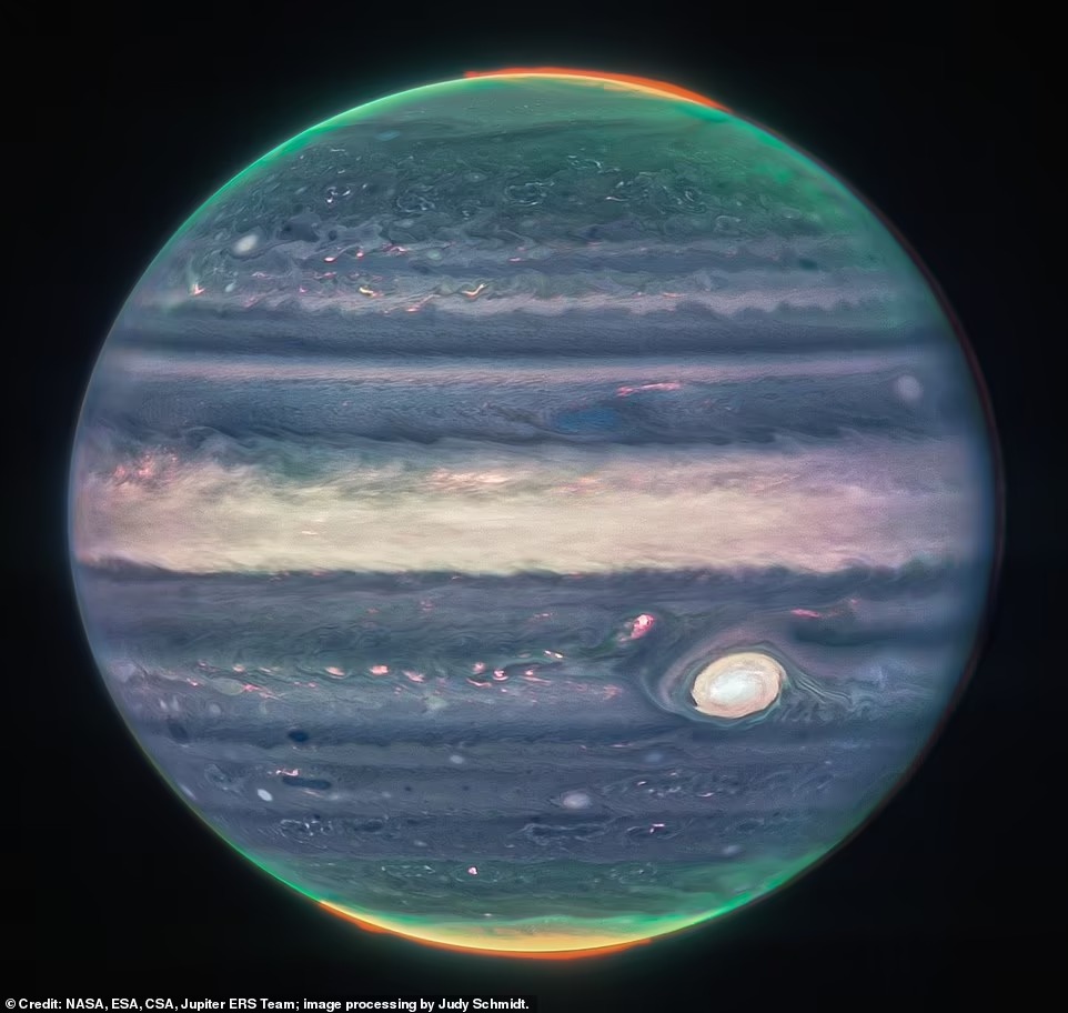 وأضاف العلماء: تُظهر الصور الرائعة منظرًا غير مسبوق للشفق القطبي المتوهج فوق القطبين الشمالي والجنوبي والبقعة الحمراء العظيمة المتوهجة على الكوكب التي تكون كبيرة بما يكفي لابتلاع الأرض.