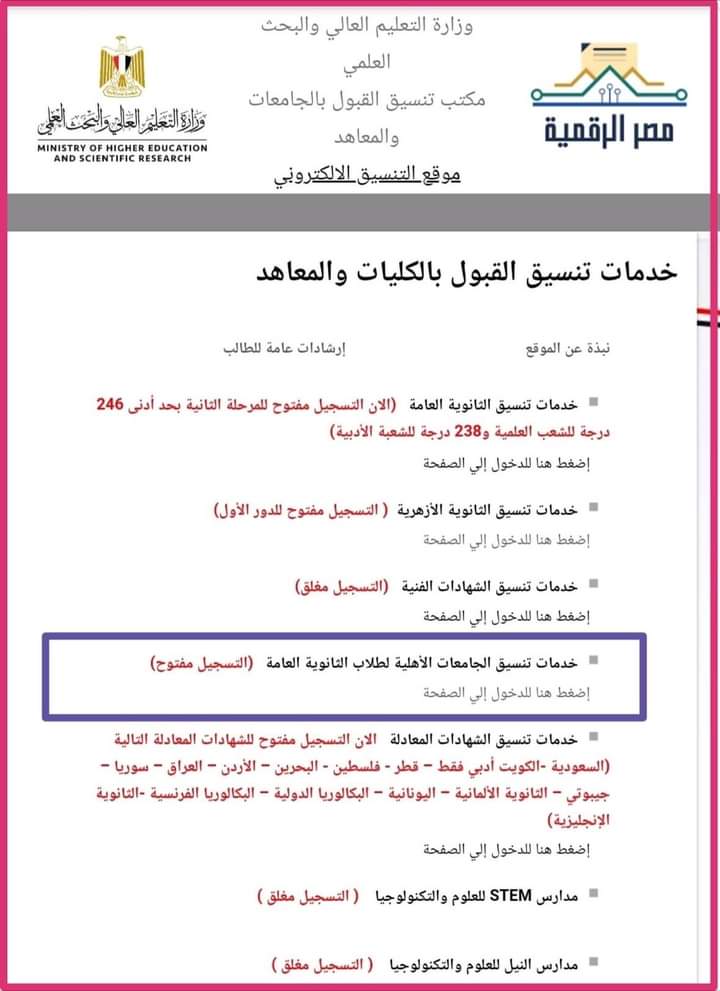 ويقدم القاهرة 24خطوات تسجيل الرغبات للالتحاق بالجامعات الأهلية حيث يقوم الطلاب بالخطوات التالية للتنسيق بـ تنسيق الكليات 2022 للجامعات الأهلية: