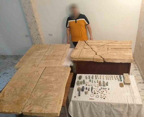 عقب تقنين الإجراءات بالتنسيق مع قطاع الأمن العام ومديرية أمن الجيزة تم استهدافه وأمكن ضبطه، وعُثر بحوزته على عدد 79 قطعة يشتبه في أثريتها مختلفة الأشكال والأحجام.