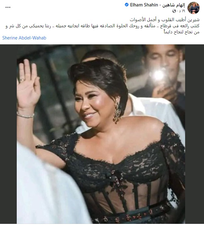 وشاركت إلهام شاهين، متابعيها صوره لشيرين عبد الوهاب، عبر حسابها الشخصي بموقع التواصل الاجتماعي فيسبوك، وعلقت عليها قائلة: شيرين أطيب القلوب وأجمل الأصوات كنتى رائعة في قرطاج، متألقة وروحك الحلوة الصادقة فيها طاقه إيجابية جميلة، ربنا يحميكى من كل شر ومن نجاح لنجاح دائمًا.