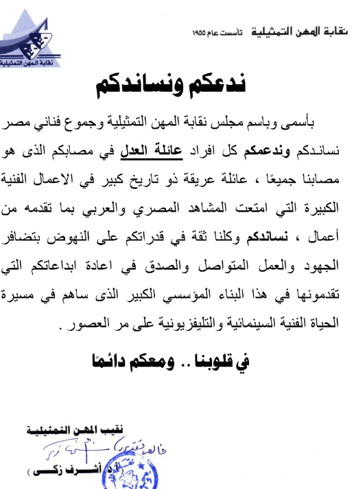 وجاء نص البيان كالتالي: ندعمكم ونساندكم باسمى وباسم مجلس نقابة المهن التمثيلية، وجموع فناني مصر، نسانـدكم وندعمكم كل أفراد عائلة العدل في مصابكم الذي هو مصابنا جميعا، عائلة عريقة ذو تاريخ كبير في الأعمال الفنية الكبيرة، التي أمتعت المشاهد المصري والعربي بما تقدمه من أعمال، نساندكم وكلنا ثقة في قدراتكم على النهوض بتضافر الجهود والعمل المتواصل والصدق في إعادة إبداعاتكم التي تقدمونها في هذا البناء المؤسسي الكبير، الذي ساهم في مسيرة الحياة الفنية السينمائية والتليفزيونية على مر العصور.. في قلوبنا.. ومعكم دائمًا