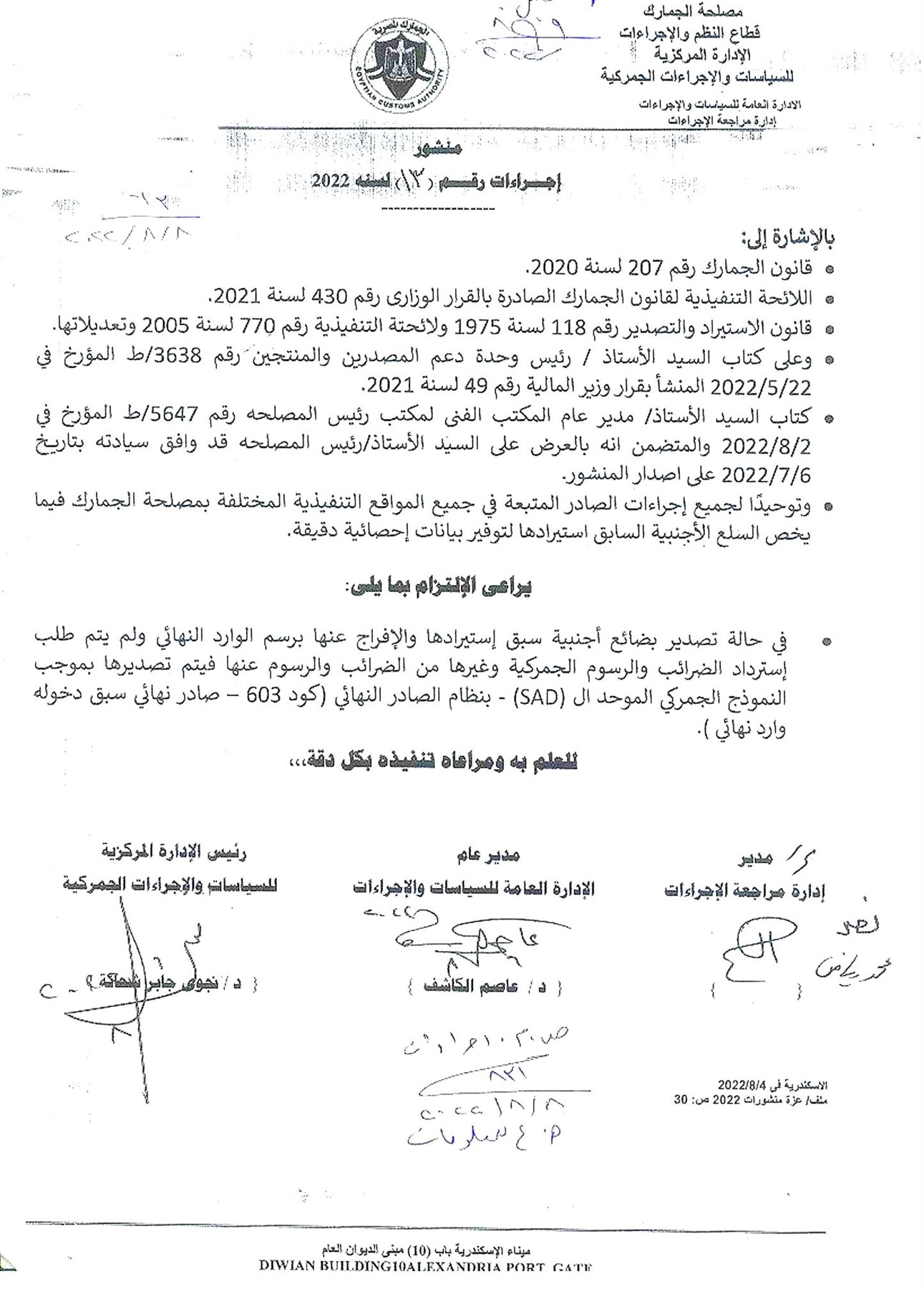 وقتها تقرر إلغاء البند رقم 11 من منشور تعليمات رئيس مصلحة الجمارك رقم 9 لسنة 2022 والاكتفاء بتطبيق المادة 67 من قانون الجمارك رقم 207 لسنة 2020 والمادة 299 من لائحته التنفيذية الصادرة بقرار وزير المالية رقم 430 لسنة 2021.