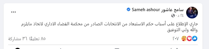 وكتب سامح عاشور في منشوره قائلًا: “جاري الاطلاع على أسباب حكم الاستبعاد من الانتخابات الصادر من محكمة القضاء الإداري لاتخاذ ما يلزم.. والله ولي التوفيق”.