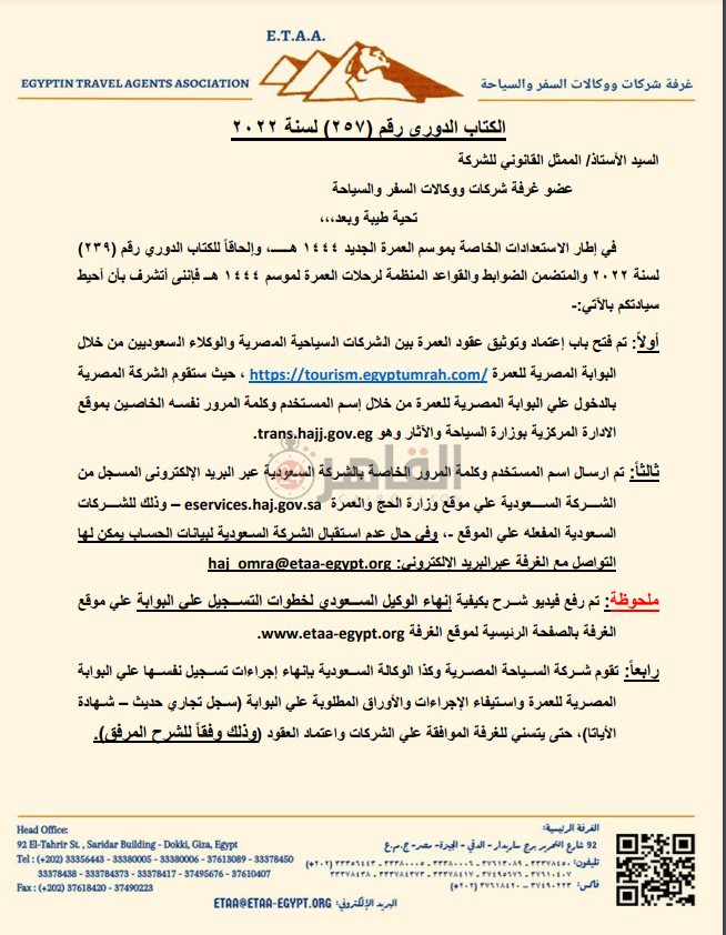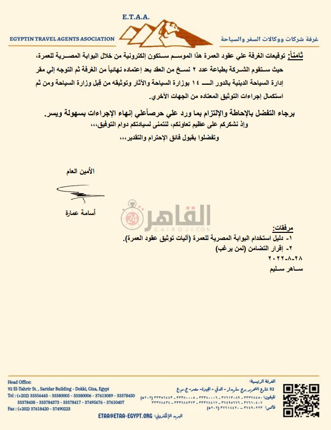 وحصل القاهرة 24 على نسخة من الخطاب الموجه من الأمين العام لغرفة شركات السياحة إلى أصحاب الشركات السياحية.