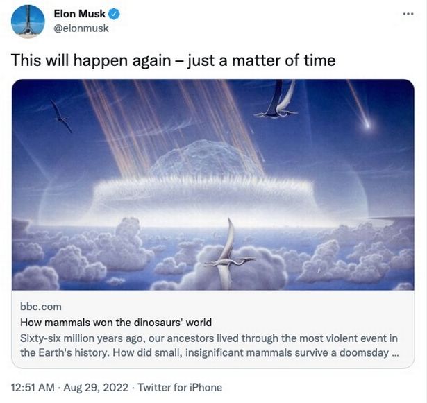 وانتقل ماسك إلى موقع التواصل الاجتماعي لتنبيه متابعيه البالغ عددهم 104 ملايين إلى نظريته المروعة، ونشر ماسك رابطًا لمقالة بي بي سي حول موت الديناصورات، وغرد: سيحدث هذا مرة أخرى، مجرد مسألة وقت، في إشارة على ما يبدو إلى الهلاك الوشيك المحتمل للبشرية.