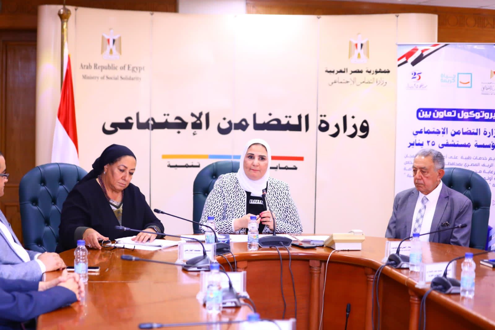 وقعت نيفين القباج وزيرة التضامن الاجتماعي والدكتورة مها الرباط رئيس مجلس أمناء مؤسسة مستشفى 25 يناير للخدمات الطبية، بروتوكول تعاون بين الوزارة والمؤسسة بشأن تقديم خدمات طبية على أعلى مستوى بالمجان في قلب الريف المصري بمحافظة الشرقية، للأشخاص الأولى بالرعاية من حاملي بطاقة تكافل وكرامة، كمشاركة أولى من المؤسسة في المبادرة الرئاسية حياة كريمة، في المجال الصحي من إنسان إلى إنسان للعلاج بالمجان.