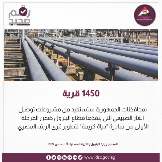 وذكر المركز الإعلامي لمجس الوزراء، خلال منشور له على صفحته الشخصية على موقع التواصل الاجتماعي فيسبوك، أن وزارة البترول والثروة المعدنية، أكدت أن أكثر من 1450 قرية في محافظات الجمهورية ستستفيد من مشروعات توصيل الغاز الطبيعي التي ينفذها قطاع البترول ضمن المرحلة الأولى من مبادرة حياة كريمة، موضحة أنه يجري الانتهاء حاليا في إطار هذه المشروعات، من توصيل الغاز الطبيعي إلى 120 قرية، بما يوفر هذه الخدمة الحضارية لنحو 413 ألف وحدة سكنية في نطاق هذه القرى.