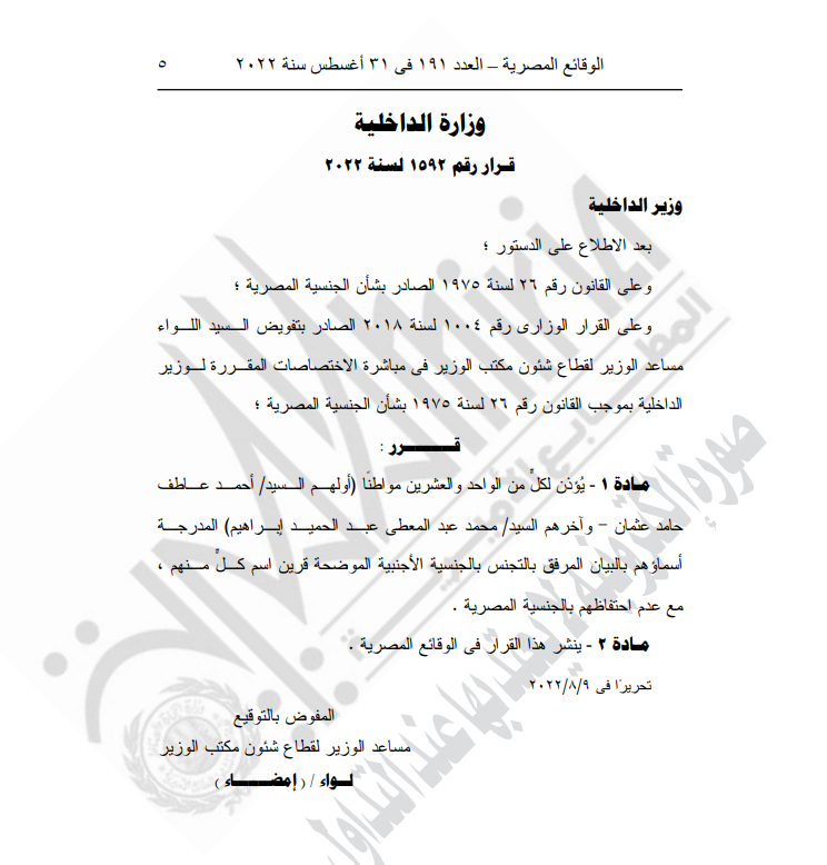 نشرت الجريدة الرسمية قرار وزارة الداخلية الذي حمل رقم 1593 لسنه 2022 الصادر من اللواء محمود توفيق وزير الداخلية، بشأن الأذن لـ21 مواطنا بالتجنيس بالجنسية الأجنبية.