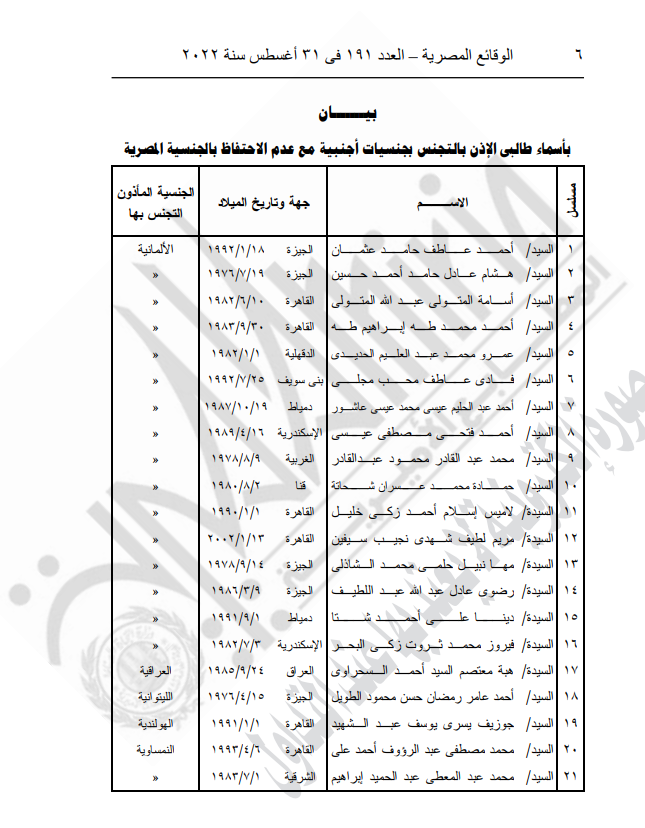 من ناحية أخرى نشرت الجريدة الرسمية قرار وزارة الداخلية الذي حمل رقم 1350 الصادر من اللواء محمود توفيق وزير الداخلية، بشأن الإذن لـ 21 مواطنا بالتجنيس بالجنسية الأجنبية، مع الاحتفاظ بالجنسية المصرية
