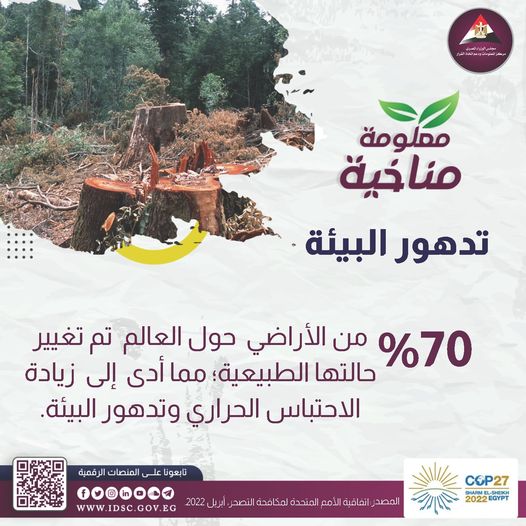 نشر مركز المعلومات ودعم اتخاذ القرار التابع لمجلس الوزراء، انفوجرافًا سلط الضوء من خلاله على 70% من الأراضي حول العالم تم تغيير حالتها الطبيعية، مما أدى إلى زيادة الاحتياس الحراري وتدهور البيئة.