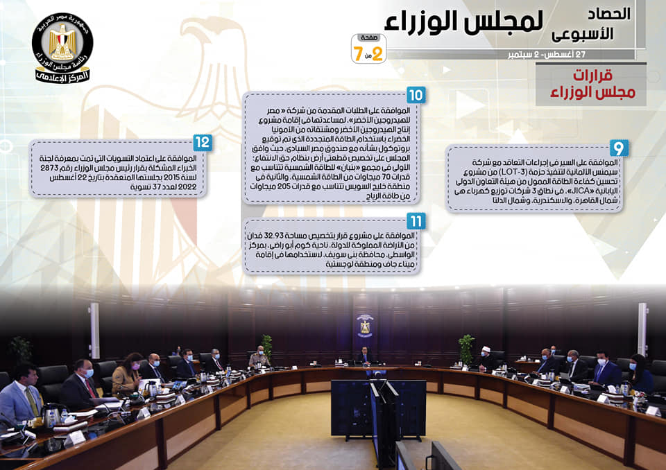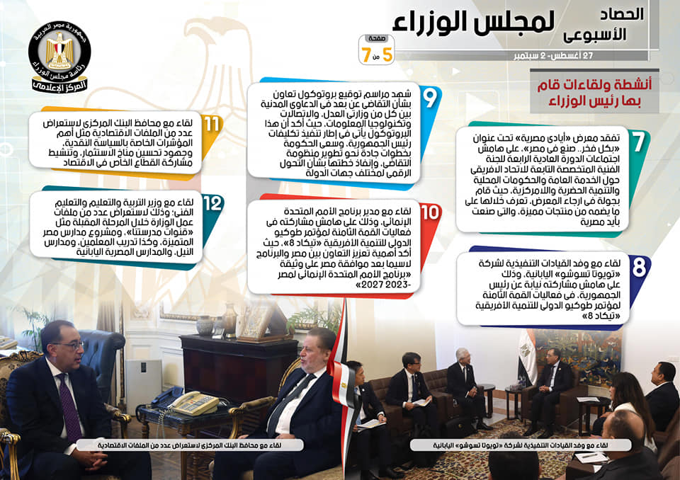 نشر المركز الإعلامي لـ مجلس الوزراء، تقريرًا شمل إنفوجرافات سلط من خلالها الضوء على الحصاد الأسبوعي لمجلس الوزراء، وذلك خلال الفترة من 27 أغسطس حتى 2 سبتمبر 2022، والذي تضمن الموافقة على عدد من القرارات، فضلًا عن الاجتماعات واللقاءات التي عقدها الدكتور مصطفى مدبولي، رئيس مجلس الوزراء، بالإضافة إلى ما نفذه من أنشطة.