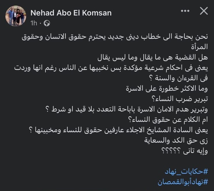 منتقدة رجال الدين.. أبو القمصان: السادة المشايخ عارفين حقوق النساء ومخبيينها