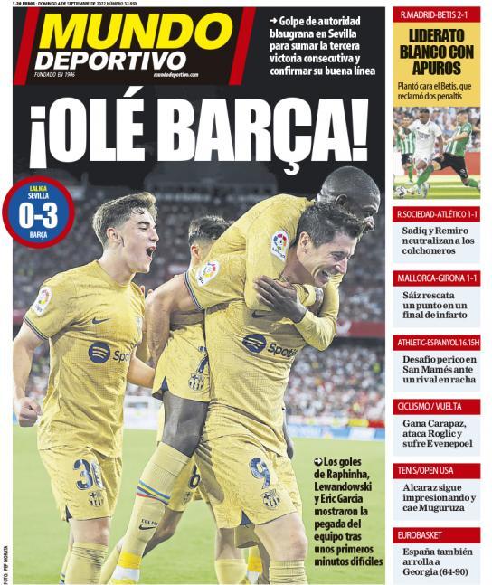 تصدر فوز برشلونة على نظيره إشبيلية بثلاثية غلاف صحيفة موندو ديبورتيفو لعدد اليوم، وذلك بعد تسجيل الثلاثي روبرت ليفاندوفسكي وإريك جارسيا ورافينيا في فوز الفريق.