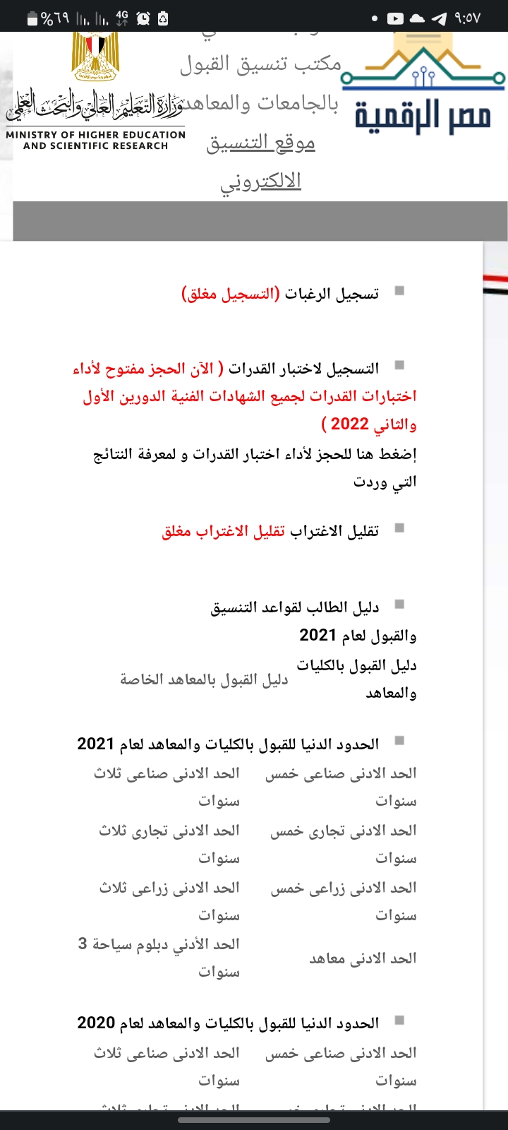 وبدأ تسجيل طلاب الدبلومات الفنية لأداء اختبارات القدرات المؤهلة للالتحاق بكليات: الفنون التطبيقية، الفنون الجميلة، التمريض، وذلك كشرط أصيل للالتحاق بالكليات، حيث يجب على الطلاب، أداء الاختبارات؛ للالتحاق بالكليات ضمن تنسيق الدبلومات الفنية 2022، وذلك في ضوء قواعد القبول الصادرة من المجلس الأعلى للجامعات، التي تشترط اجتياز اختبارات القدرات، كشرط من شروط القبول بهذه الكليات.