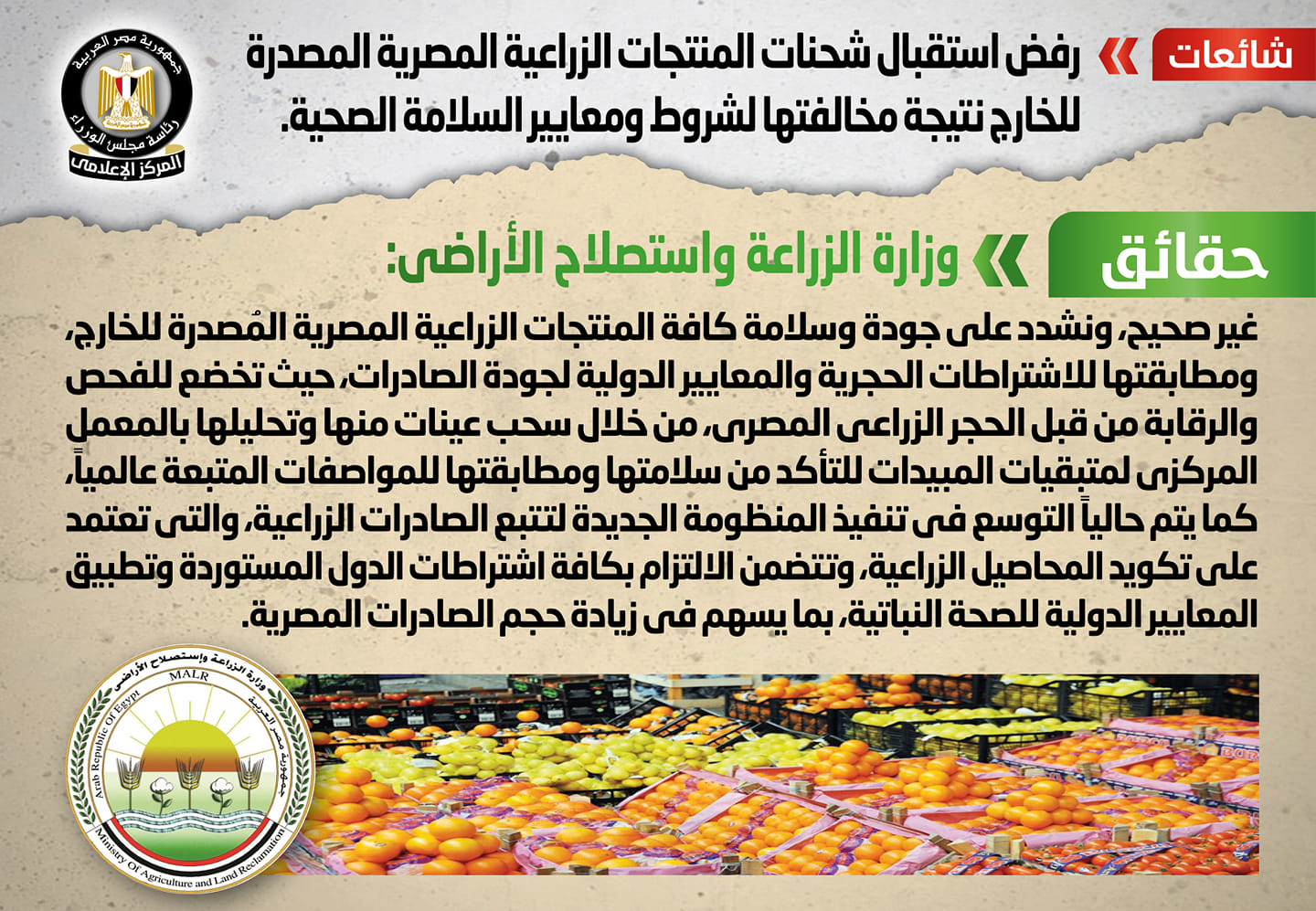 وتواصل المركز الإعلامي لمجلس الوزراء، مع وزارة الزراعة واستصلاح الأراضي، والتي نفت تلك الأنباء، مُؤكدةً أنه لا صحة لرفض استقبال شحنات المنتجات الزراعية المصرية المصدرة للخارج نتيجة مخالفتها لشروط ومعايير السلامة الصحية.