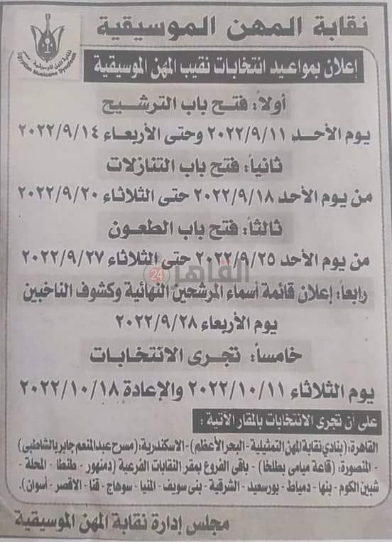 وكشف الإعلان الرسمي، كافة التفاصيل لانتخابات المهن الموسيقية على مقعد النقيب، حيث ذكر ما يلي:
