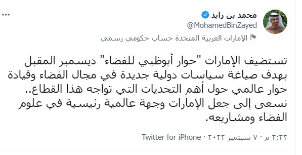 أعلن الشيخ محمد بن زايد، رئيس دولة الإمارات العربية المتحدة، أن بلاده تستضيف حوار أبوظبي للفضاء، خلال شهر ديسمبر المقبل، بهدف صياغة سياسات دولية جديدة في مجال الفضاء وقيادة حوار عالمي حول أهم التحديات التي تواجه هذا القطاع.