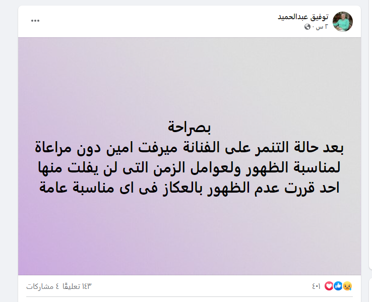 قال الفنان توفيق عبد الحميد، على صفحته الرسمية على فيسبوك:( بصراحة بعد حالة التنمر على الفنانة ميرفت أمين دون مراعاة لمناسبة الظهور ولعوامل الزمن التى لن يفلت منها أحد قررت عدم الظهور بالعكاز فى أى مناسبة عامة)، وقد انهالت عليه دعوات المتابعين لصفحته بالشفاء من المرض، كما تلقّى عشرات ومئات الإعجابات والدعم من المتابعين، مستنكرين ما حدث ضد الفنانة ميرفت أمين والتنمر عليها.
