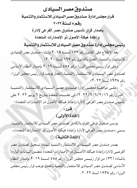 نشرت الجريدة الرسمية، في عددها الصادر اليوم الخميس 8-9-2022، قرار مجلس إدارة صندوق مصر السيادي للاستثمار والتنمية، رقم 8 لسنة 2022.
