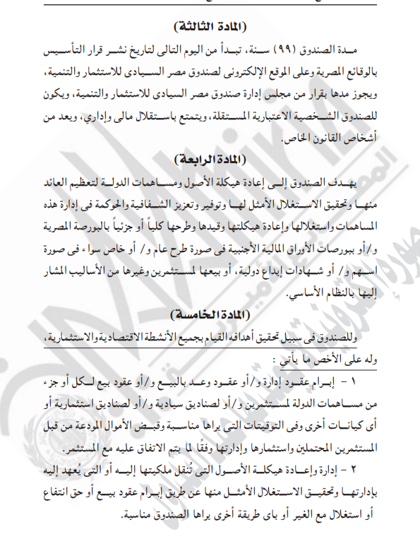 وذكرت الجريدة، أن مجلس إدارة صندوق مصر السيادي للاستثمار والتنمية، أصدر قرار تأسيس صندوق مصر الفرعي لإدارة وإعادة هيكلة الأصول ذو الإصدارات المتعددة، وذلك بعد الاطلاع على القانون رقم 177 لسنة 2018 بإنشاء صندوق مصر السيادي للاستثمار والتنمية، المعدل بالقانون رقم 197 لسنة 2020؛ وعلى قرار رئيس مجلس الوزراء رقم 555 لسنة 2019 بإصدار النظام الأساسي لصندوق مصر السيادي للاستثمار والتنمية والمعدل بموجب قرار رئيس مجلس الوزراء رقم 1938 لسنة 2022.