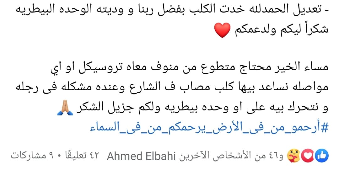 وبعدها نشر الشاب منشورا على موقع التواصل الاجتماعي فيسبوك كتب فيه: محتاج متطوع من منوف معاه تروسيكل أو أي مواصلة نساعد بيها كلب مصاب في الشارع، وعنده مشكله في رجله ونتحرك بيه على أي وحدة بيطرية، ولكم جزيل الشكر، وبعد انتظار لساعات وجد عبد الرحمن تروسيكل لنقله إلى الوحدة البيطرية.