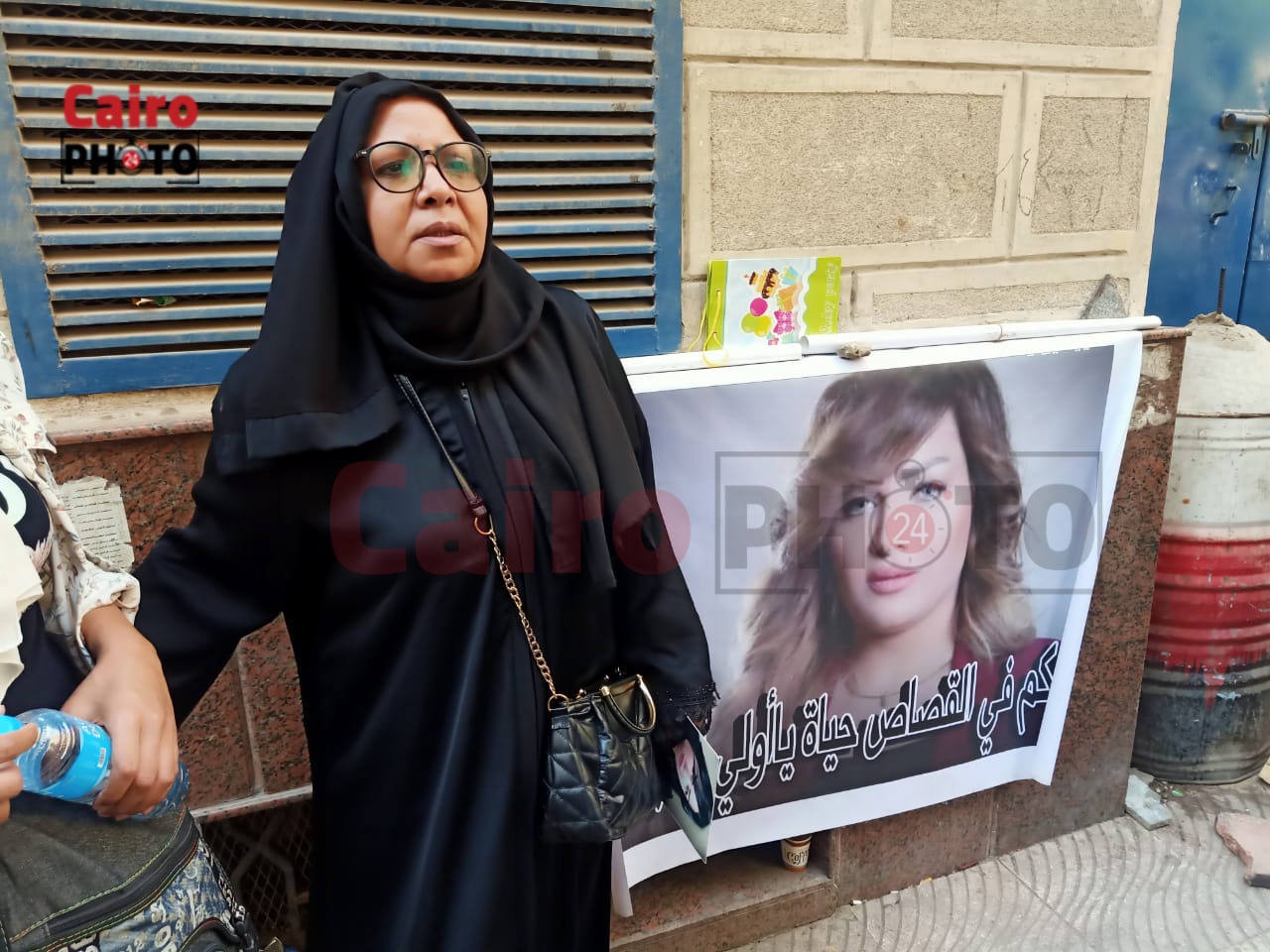 والتقطت عدسة القاهرة 24، عدد من الصور لوالدة المذيعة شيماء جمال وهي ترتدي زي أسود اللون وتحمل صور ابنتها الضحية، وتردد: حقك هجيبة.